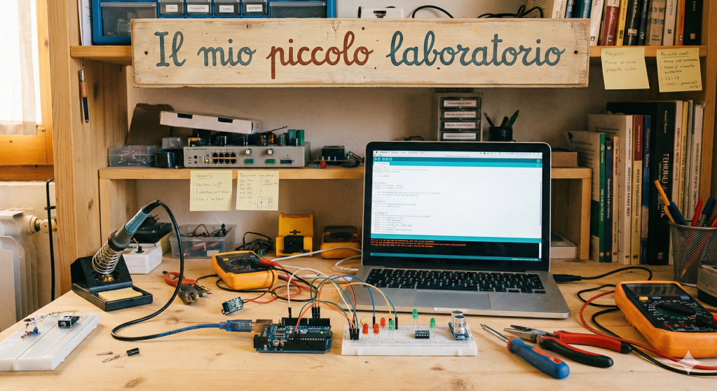 Benvenuti nel mio piccolo laboratorio (o per lo meno la sua rappresentazione digitale!). Sono uno sviluppatore ed ho iniziato da poco a giocare con Arduino, che dire… Mi ha subito conquistato! L’idea di utilizzare il software per poter influenzare comportamenti di componenti reali è veramente figo!